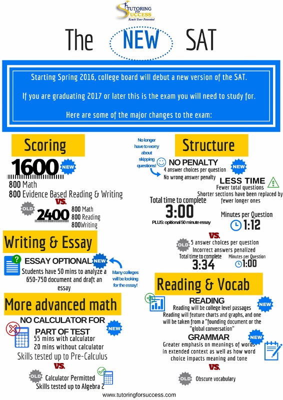 As 2015 comes to an end, there are many things to think about going into the new year. One thing you can add to that list is college board’s debut of a new version of the SAT beginning in March, 2016. We’ve created an easy way for you to break down the differences between the old SAT and new SAT.